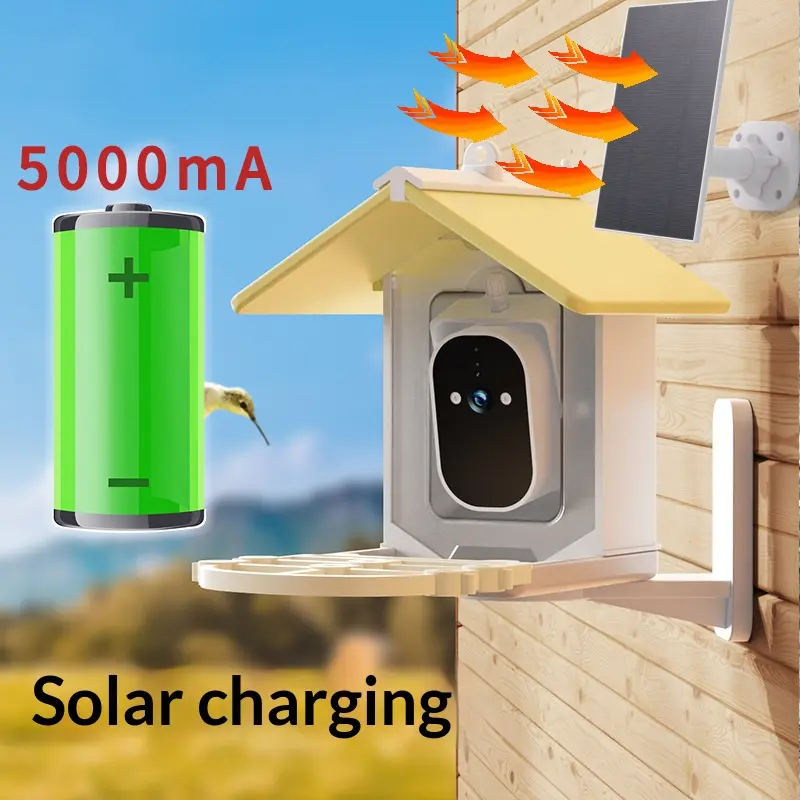 Key features: 5-megapixel HD camera pointing at the perch, 4000mAh lithium battery with solar panel trickle charging for indefinite outdoor operation, AI bird species identification, IP65 weatherproofing, cloud storage support, and two-way voice intercom. ABS construction with UV-stable coating for long outdoor service life. Target retail tier: USD 129 to 199.