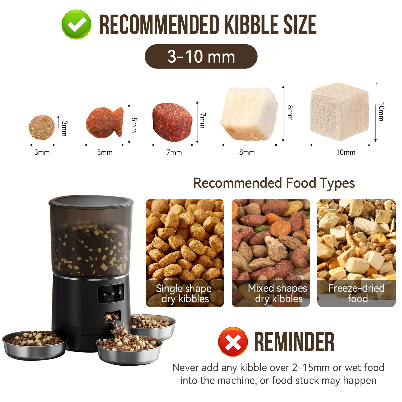 Three separate bowls allow scheduled feeding across multiple dogs or multiple meals with clear separation. The 6-liter hopper capacity holds 5 to 7 days of food for a medium-to-large dog. Tuya Smart 2.4G WiFi is standard, giving brands a fast path to a white-label app.