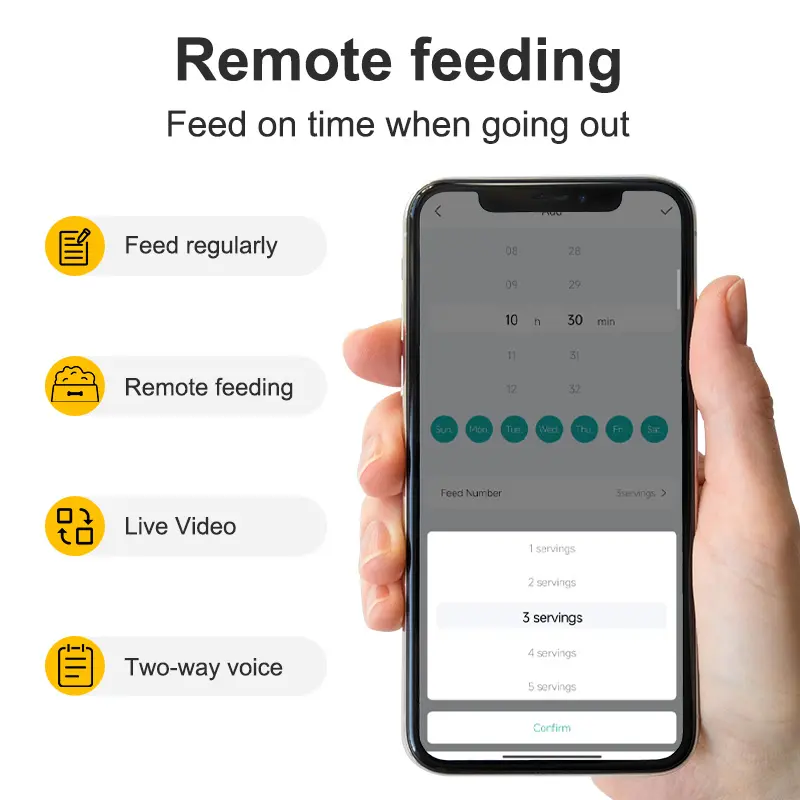 Remote Feeding (Mobile): Controlled via mobile app; supports manual feeding of 1–10 portions per session